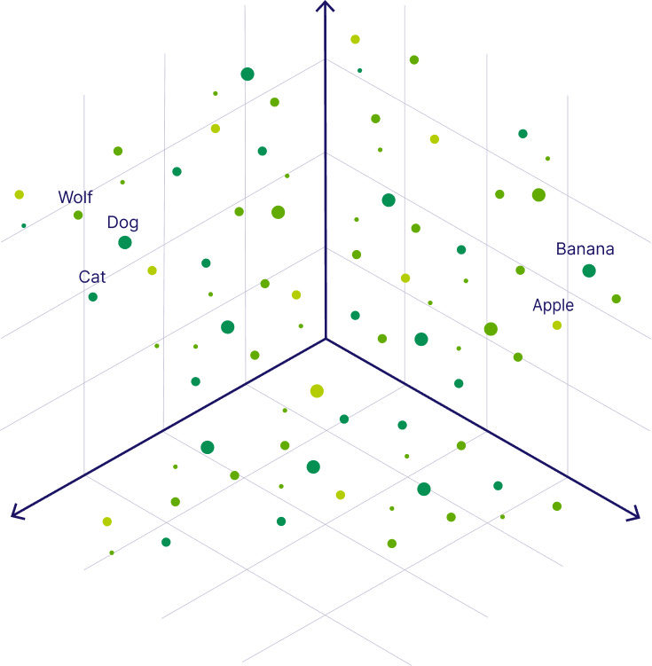 Illustration of a 3D vector space where data points represent words grouped by similarity. For instance, ‘Wolf’, ‘Dog’, and ‘Cat’ are closer together in space, while ‘Apple’ and ‘Banana’ form a distinct cluster, demonstrating semantic relationships in a vector database.